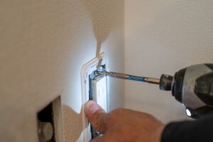 写真は、既存壁面へ新たにコンセントを設置している作業中の様子です。ドライバーで丁寧に固定し、配線の結線を確実に行います。電気工事は資格が必要な作業のため、富士吉田市でのコンセントの増設工事も有資格者が対応しています。